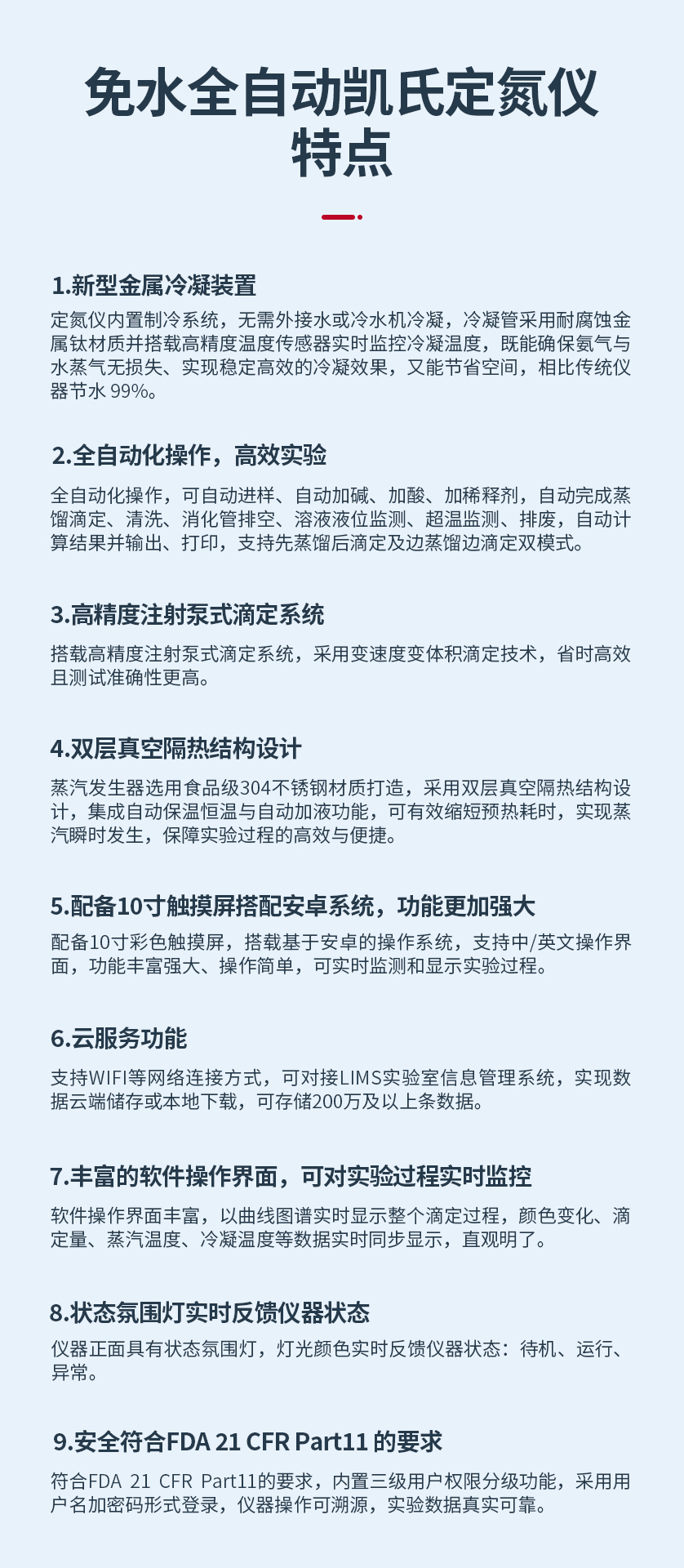 定氮儀內(nèi)置制冷系統(tǒng),無需外接水或冷水機冷凝,冷凝管采用耐腐蝕金屬鈦材質(zhì)并搭載高精度溫度傳感器實時監(jiān)控冷凝溫度,既能確保氨氣與水蒸氣無損失、實現(xiàn)穩(wěn)定高效的冷凝效果,又能節(jié)省空間,相比傳統(tǒng)儀器節(jié)水 99%。