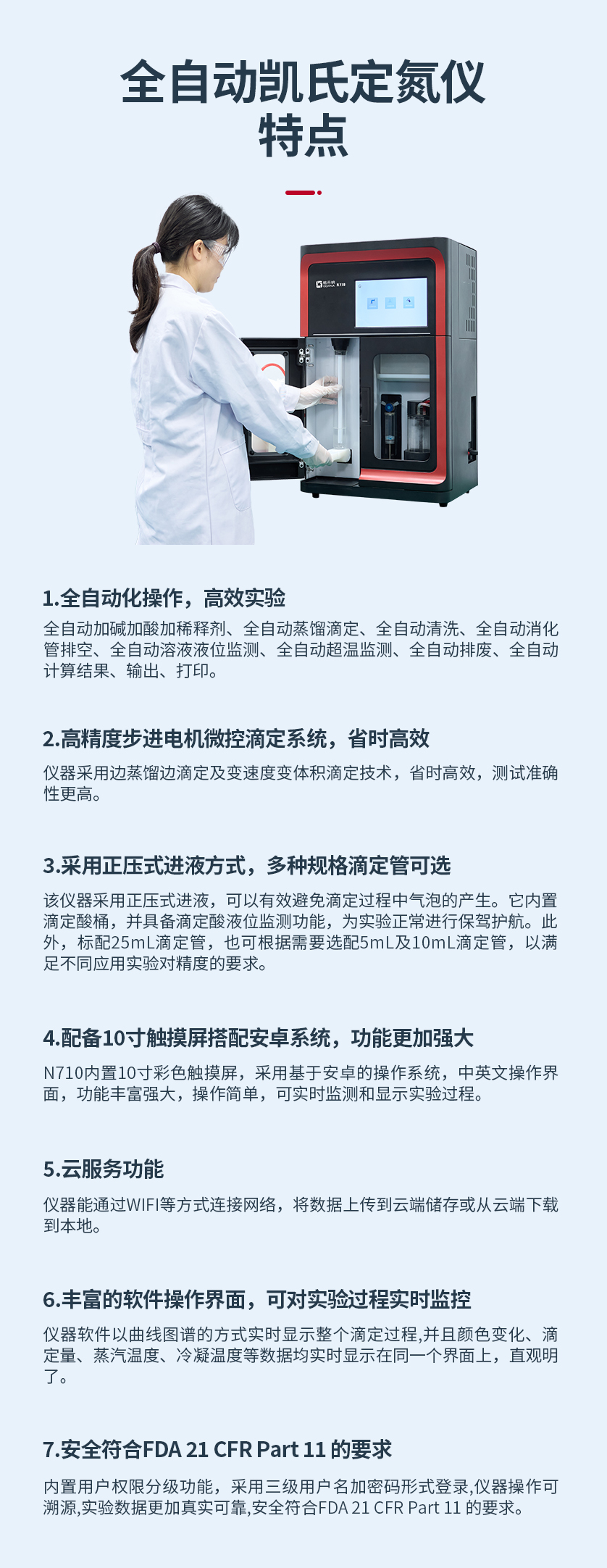 新一代N710全自動凱氏定氮儀集成了自動加堿加酸、自動加稀釋劑、蒸餾滴定、消化管排空、溶液液位監(jiān)測、超溫監(jiān)測、清洗排廢、結(jié)果計算等功能。采用符合國家標(biāo)準(zhǔn)的凱氏定氮方法:濃硫酸環(huán)境消解樣品、堿性環(huán)境蒸汽蒸餾、硼酸吸收、加指示劑滴定、終點顏色判定法。