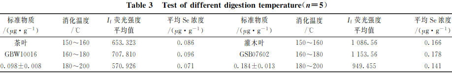 準確稱取2.0g(精確至0.0001g)植物標樣茶葉(GBW10016)樣品和灌木葉(GSB07602)樣品各15份,分3組,每組5次重復稱樣,以2.2中HNO3+HClO4(V+V)(8+2)mL混酸比溶液進行消化處理,再以不同的消解溫度進行消化處理,測試硒的相對熒光值,結果見表3。