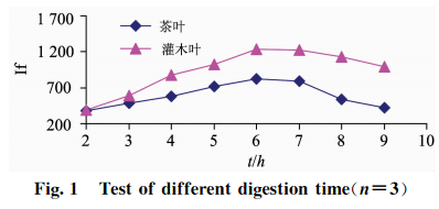 準確稱取2.0g(精確至0.0001g)植物標樣茶葉(GBW10016)樣品和灌木葉(GSB07602)樣品各24份,分8組,每組3次重復稱樣,以2.2中HNO3+HClO4(V+V)(8+2)mL混酸比溶液,以表3中的160~180C為消化溫度,分別設定8組消化時間為2,3,4,5,6,7,8,9h,測試硒的相對熒光值,結果見圖1。