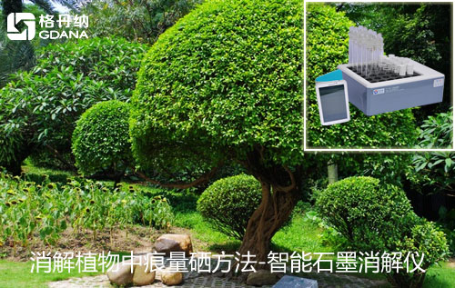稱取2.0g(精確至0.0001g)洗凈60C烘干粉碎的植物樣,加入10.0mL硝酸十高氯酸(8+2)(g)混酸及幾粒玻璃珠于100mL刻度消解管中,上端放彎頸玻璃小漏斗便于回流,混勻放置在石墨消解儀的石墨加熱孔中,于通風良好的通風櫥內冷消化過夜12h后,石墨消解儀會按預先設定的消解程序進行升溫消化,升溫程序為:室溫→50C保持0.5h100C保持1h-→160C保持2h→-180C保持,保持時間視樣品消化情況而定。其間要觀察消化液顏色,若較深,及時補加硝酸,反復多次,直到沒有棕色氮氧化物氣體冒出。當溶液變為清亮無色并伴有濃白煙岀現時,繼續保持180C加熱,其間可加入1~2mL純水1~2次,目的是趕殘余酸,這樣可以解決濕法消解測定空白高的特點,直至加熱消化到剩余體積為2mL左右時,切不可蒸干,取下冷卻至室溫,再加入5.0mL50%HCl(g)于剩余消化液中,再次至于消解儀中升溫至100C(或沸水浴加熱),保持10~15mn,溶液變為清亮無色并伴有白煙時,逐將Se+還原成Se+。取出冷卻用純水定容至25mL,密封搖勻備用。同時做試劑空白。
