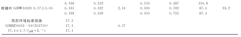 分別選取灌木葉、大米、圓白菜、茶葉和柑橘葉五種植物標準樣品,每種重復3次準確稱取2.0g(精確至0.0001g),按上述實驗條件進行消解,測定本底值。再對每種植物標樣稱取子樣,每種重復3次準確稱取2.0g(精確至0.0001g),此次每種試樣中分別加入1.0mg?L-1硒標準溶液150,300,450gL,進行消解并測定加標后值,同時測定硒質控環境標準溶液(GSBZ50031-94(203710)),結果見表4。可見,硒標準加標回收率在87.1%~106.2%之間,精密度(n=3)在0.83%~5.69%之間,所測結果均與標準物質的參考值吻合,完全達到分析要求。