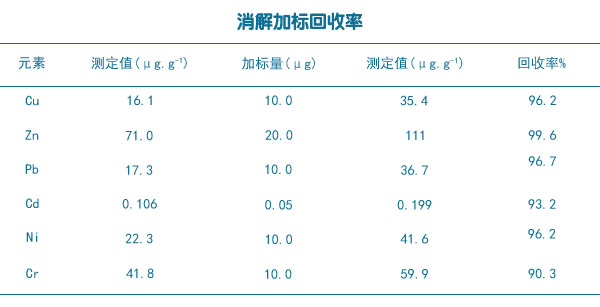 稱取若干份0.5g(精確至0.0001g)棕壤土樣品,分成平行的兩組,其中一組加入一定質量的標液,然后用全自動石墨消解儀法對兩組樣品進行消解,完成后對土壤樣品中的Cu、Zn、Pb、Cd、Ni和Cr六種重金屬元素含量進行分析,計算樣品加標回收率如下表所得。
