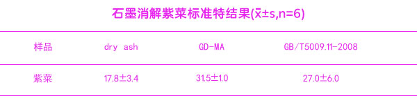 分別采用石墨消解灰化法(GD—MA)和GB/T5009.11—2003中總砷的干灰化法(dryash)處理樣品,測定紫菜(GBW10023)成分分析標準物質中總砷含量,結果見表【石墨消解紫菜標準物結果】。