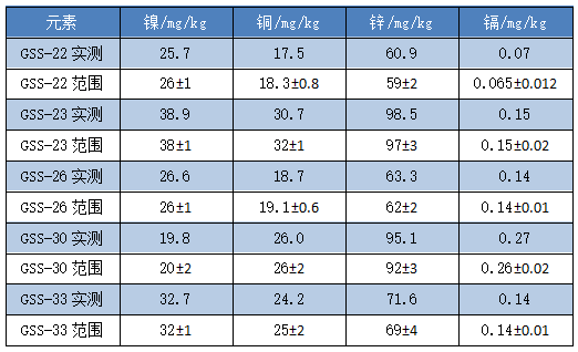 實驗發(fā)現(xiàn)除GSS-23的銅元素檢測值略低于不確定度范圍, GSS-30的鋅元素檢測值略高于不確定度范圍,其余樣品的四類元素檢測結(jié)果均在標準值不確定度范圍之內(nèi),滿足實驗室土壤檢測實驗的要求。