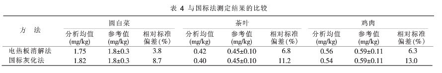 以圓白菜標準物質(CBW10014)茶葉標準物質(GBW10016)、雞肉標準物質(GBW10018)為比對樣品,設置5個平行,用新建預處理方法與國家標準中灰化法同時測定3種比對樣品,并對結果進行比較。