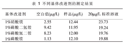 分別選用濃度為5%的硝酸鎂、磷酸二氫銨、磷酸氫二銨、磷酸銨溶液作為基體改進劑對鉻標樣及樣品進行測定。具體測定方法同其他幾項。