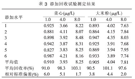 在菜心、大米粉2個樣品中分別添加水平為1.0、4.0、8.0μgL的標準使用液,試驗設各個平行,各樣品加標回收率和精密度的結果見表3。結果表明,本方法測定兩種樣品,添加回收率高(90%~105%),多次測定結果平行性好。