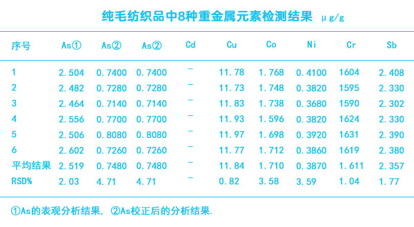 面對紡織品重金屬的危害,國家也制定了標準GB/T1759321998《紡織品重金屬離子試驗方法-原子吸收分光光度法》,在本次實驗中我們采用實驗電加熱板+HNO3+HClO4濕法消化法處理來消解樣品,分析純毛紡織品中的8種重金屬元素Pb,As,Cd,Co,Cu,Ni,Sb,Cr的影響,為紡織品行業檢測提供經驗。