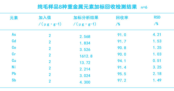 為了驗證實驗結果的可靠性,在準確測定純毛樣品中8種重金屬元素的基礎上,進行加標回收實驗。實驗檢測結果如下表: