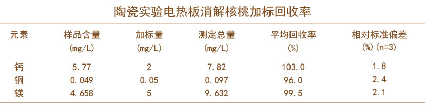 采用陶瓷實驗電熱板濕法消解核桃,測定核桃仁中多種元素的方法,可以用來選取品質高的核桃及檢驗核桃營養含量,通過加標回收率實驗證明該方法具有操作簡單,符合實驗要求,可用于同類產品的元素檢測。