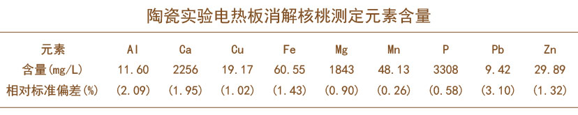 文章中通過陶瓷實驗電熱板對核桃進行常壓濕法消解,測定核桃中的無機元素含量,對重金屬含量分析提供經驗。實驗電熱板消解方法安全、可靠,為核桃的營養成分研究打開科學之路。
