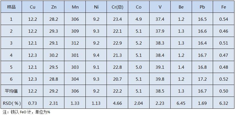 從上表結果得出,各元素的相對標準偏差在0.73%~6.45%之間,符合實驗室要求,方法適用于環境樣品預處理。