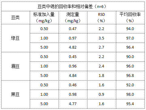 選取綠豆、眉豆、黑豆進行精密度和準確度試驗,每種豆類各添加0.50、1.00、 5.00 mg/kg的鍶溶液進行加標回收實驗,每個加標水平取6個平行樣,結果見表。由表可以看出,平均回收率在90.0~98.0 %之間,相對標準偏差(n=6)在0.9~3.5%之間,說明方法的精密度和準確度良好,建立的測試方法能滿足豆中鍶元素的分析測定。