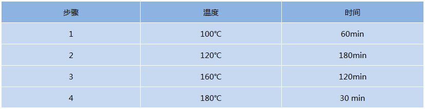 稱取0.2g(精確至0.1mg)樣品于聚四氟解管中,用少量水潤(rùn)濕;加入5ml鹽酸。打開平板啟動(dòng)設(shè)置好的程序開始加熱(消解程序下如表),100℃消解保持60min;加5ml硝酸、5ml氫氟酸、1ml高氯酸,加蓋,120℃消解保持180min;開蓋,160℃消解保持120min;最后溫度提高到180℃趕酸,當(dāng)加熱至冒濃厚高氯酸白煙時(shí),加蓋,待消解管壁上的黑色有機(jī)物消失后,開蓋,驅(qū)趕白煙并蒸至內(nèi)容物呈不流動(dòng)狀態(tài)的液珠狀。用1%硝酸溫?zé)崛芙饪扇苄詺堅(jiān)D(zhuǎn)移至25ml容量瓶中定容,搖勻,待測(cè)。同時(shí)做空白樣品。
